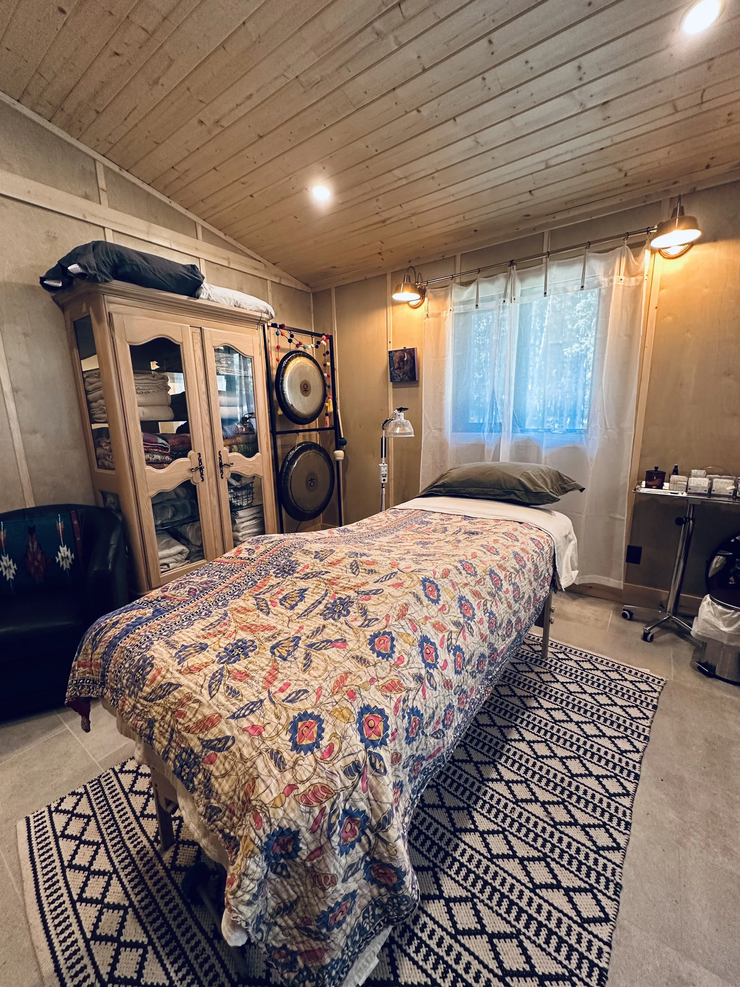 All your appointments will take place in our cozy treatment rooms. The quiet setting allows the client to unwind in a peaceful, tranquil atmosphere. Our treatment rooms feature Jadite & Tourmaline heated grid mats because we want only the best for our clients. These are non EMF grounding mats that provide an anchor for your treatment.